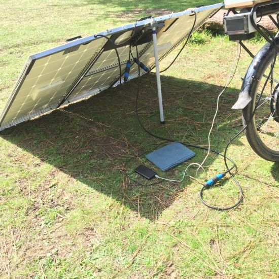 When preparing for this trip I made a rough calculation that I would need 3 panels to power my bicycle. At each stop I would set up the 3 panels aim them at the sun collecting between 120..200W (total output of 3 panels) depending on the suns intensity. While cycling I still collect some power from the top panel but this energy is only a very small portion (20..30%) of the total energy needed for the trip.